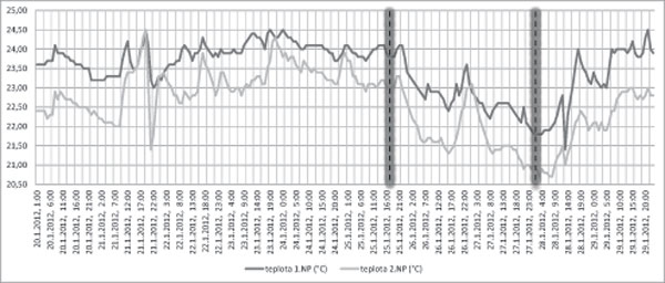 Obr. 6  Priebeh vnútornej teploty na 1. NP a 2. NP (°C) v čase od 20. 1. do 30. 1. 2012