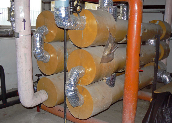 Teplá voda (TV) sa pre potreby základnej školy pripravuje dvojstupňovo, a to pomocou dvoch radov rúrových výmenníkov (obr. 5).