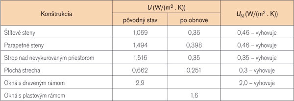 V tab. 1 sú uvedené hodnoty súčiniteľa prechodu tepla stavebných konštrukcií a ich posúdenie podľa normy STN 73 0540. Je zrejmé, že všetky opatrenia vykonané v rámci obnovy prinesú zlepšenie a pomôžu dosiahnuť vyhovujúci stav podľa tejto normy.