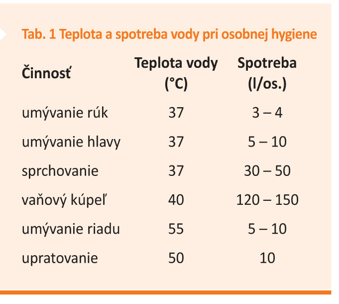 Štatisticky sa za bežnú priemernú spotrebu (teplej) vody v domácnosti počíta 50 l na osobu. V tab. 1 je zobrazená spotreba a teplota vody pri niektorých hygienických činnostiach [18].
