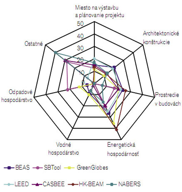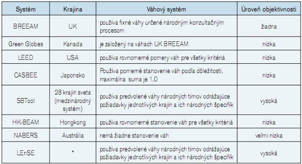 Analyzovať a stanoviť váhy významnosti jednotlivých kritérií hodnotenia podľa ich relatívnej dôležitosti je nevyhnutné z hľadiska objektivizovania a transparentnosti environmentálneho hodnotenia budov. V tab. 1 sú uvedené váhové systémy a úrovne objektívnosti najvýznamnejších systémov komplexného hodnotenia udržateľnosti/environmentálnej vhodnosti budov.