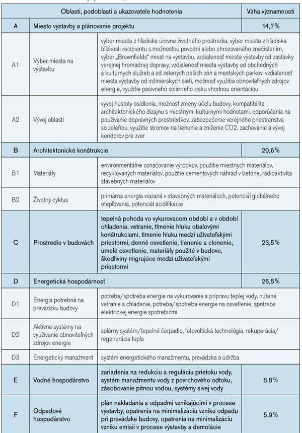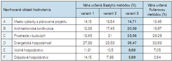 V tab. 4 sú navrhnuté oblasti hodnotenia označené písmenami A až F a ich váhy významnosti, ktoré sa určili pomocou Saatyho metódy v troch variantoch a Fullerovej metódy. Stanovené váhy významnosti sa konfrontovali s váhami oblastí v systémoch používaných vo svete. Na základe porovnania a dôslednej analýzy týchto variantov sa vybral ako najvhodnejší tretí variant vytvorený pomocou Saatyho metódy.