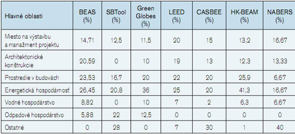 Tab. 5 Váhy významnosti oblastí v systémoch environmentálneho hodnotenia budov