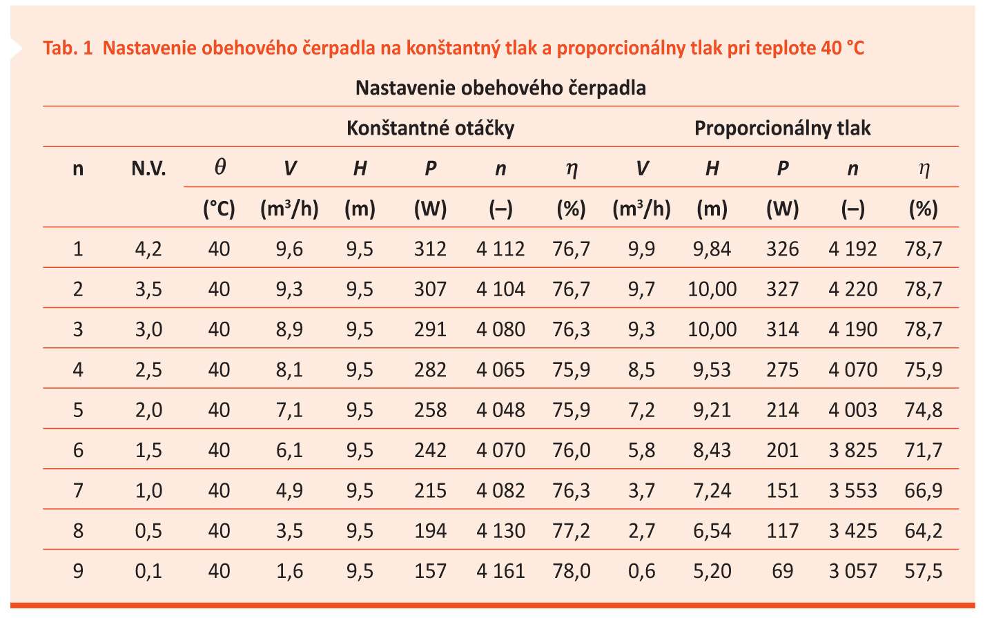 Pri nastavení OČ na reguláciu na proporcionálny tlak môžeme potvrdiť, že s klesajúcim objemovým prietokom adekvátne klesá aj dopravná výška obehového čerpadla H (m), ako to možno vidieť v tab. 1. Proporcionálne s dopravnou výškou klesá aj potrebný príkon P (W), otáčky čerpadla n a následne aj jeho účinnosť η (%).