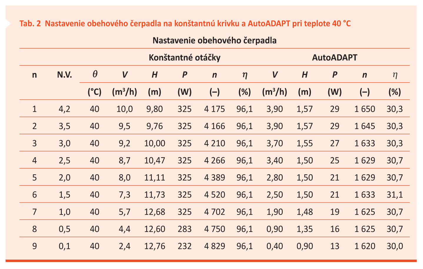 Posledným meraným spôsobom regulácie bolo nastavenie obehového čerpadla na funkciu AutoADAPT, ktorá by mala samostatne zabezpečiť a vyhodnotiť požiadavky vykurovacej sústavy a podľa nich nastaviť prevádzku obehového čerpadla. Ako môžeme sledovať z tab. 2, samotný objemový prietok V (m3/h) bol pri úplne otvorenom regulačnom ventile (4,2) o 50 % nižší ako pri všetkých ostatných prípadoch.