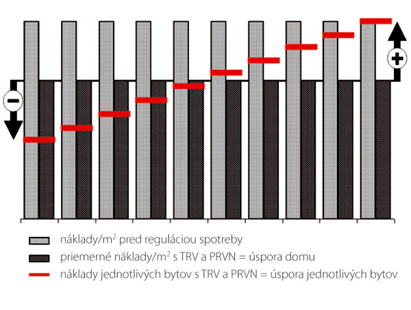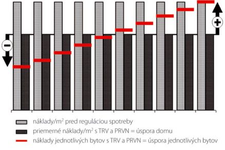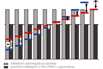 • Užívateľ s najvyšším počtom dielikov zaplatí najviac toľko, koľko zodpovedá nepretržitému odberu tepla v čase pred inštaláciou termostatických ventilov (najviac 140 % priemerných nákladov na vykurovanie na 1 m2 v dome).