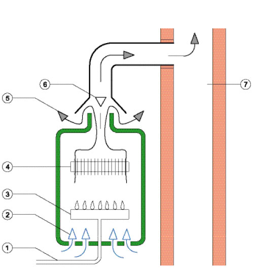 Obr. 2 Plynový spotrebič v zhotovení B (ohrievač vody) 1 – prívod plynu, 2 – spaľovací vzduch, 3 – atmosférický horák, 4 – výmenník tepla, 5 – únik spalín pri nepriaznivých vplyvoch v komíne, 6 – prerušovač ťahu, 7 – komín