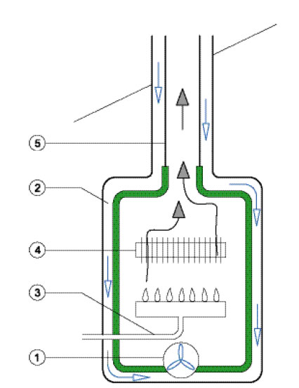 Obr. 6 Plynový spotrebič v zhotovení C (kotol) 1 – pretlakový horák, 2 – spaľovací vzduch, 3 – prívod plynu, 4 – výmenník tepla, 5 – komín