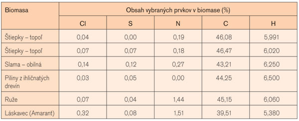 Tab. 1 Obsah niektorých prvkov v biomase (%)