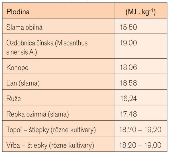 V súčasnosti sa na spaľovanie hodí najmä drevná biomasa (dendromasa) z rôznych drevín, príp. aj obilná slama a energetické plodiny (fytomasa). Je zaujímavé, že fytomasa z rôznych druhov plodín a kultivarov má v suchom stave veľmi podobné chemické zloženie. Tvorí ju približne 44 až 48 % uhlíka, 44 % kyslíka a 5,5 až 6,5 % vodíka (tab. 1). Z tohto faktu tiež vyplýva skutočnosť, že spaľovacie teplo fytomasy rôznych plodín je skoro rovnaké, obyčajne sa pohybuje medzi 17,5 až 19,50 MJ . kg-1 v celkom suchom stave, teda v sušine (tab. 2). Veľkou prednosťou biopalív pri porovnaní s hnedým uhlím je, že až na minimálne výnimky neobsahujú síru a ich spaľovanie teda nie je zdrojom SO2. Obsah popola v biomase je zvyčajne veľmi nízky (pri dreve sa hodnoty pohybujú v priemere okolo 1 %), ale jeho podiel najmä pri bylinných rastlinách môže byť nezvyčajne vysoký (napr. 20 % – láskavec, 25 % – ryža).