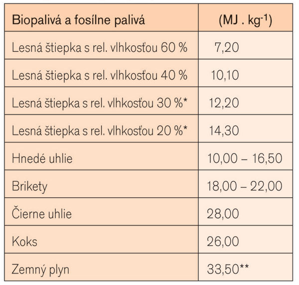 V tab. 3 možno vidieť vplyv relatívnej vlhkosti na výhrevnosť biomasy a príklad výhrevnosti rôznych palív používaných v súčasnosti. Z uvedených hodnôt je zrejmé, že výhrevnosť biomasy (vo forme štiepok) je približne rovnaká ako je výhrevnosť hnedého uhlia.
