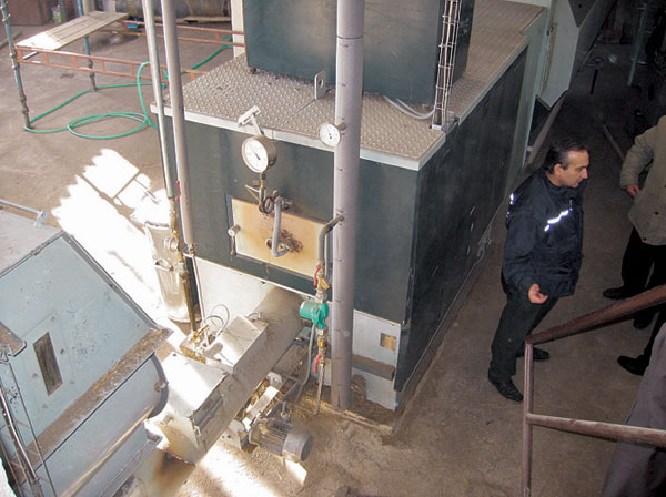 | Obr. 3 Pohľad na dopravník a rozdružovač (drvič) slamy | Obr. 5 Pohľad na horák a za ním umiestnený kotol |