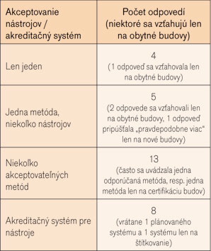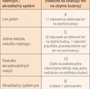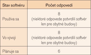 Takmer všetci respondenti mali alebo plánovali softvér na podporu článku 3 smernice týkajúceho sa metodiky. Rovnaký bol počet respondentov, ktorí už mali softvér, a tých, čo ho iba vyvíjali. V niektorých prípadoch mali respondenti softvér vyvinutý (zatiaľ) len na použitie pre obytné budovy. Odpovede sú zhrnuté v tab. 1.