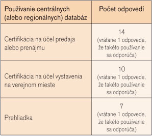 Očakáva sa, že používanie databáz bude veľmi bežné. Najviac respondentov zamýšľa databázy na certifikáciu na účel predaja alebo prenájmu, mnohí na certifikáciu na účel vystavenia na verejnom mieste a niekoľkí na účel prehliadky. Odpovede sú zhrnuté v tab. 10.