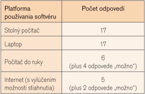 Najviac respondentov zamýšľalo používať softvér na stolných počítačoch a laptopoch. Menší počet mal záujem aj o počítače do ruky alebo internetový prístup. Vo väčšine prípadov však internetový prístup znamenal skôr schopnosť stiahnuť softvér na lokálne používanie než priame on-line používanie. Odpovede sú zhrnuté v tab. 2.