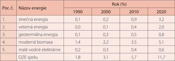 Tab. 1: Predpokladaný svetový vývoj využívania OZE