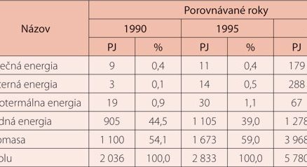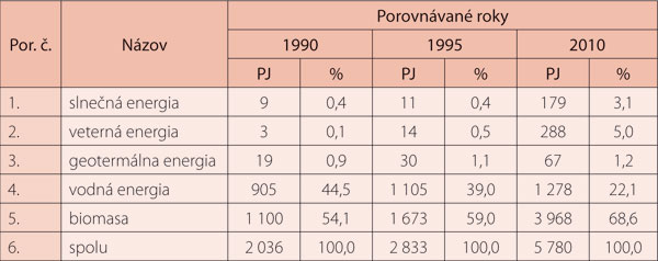 Obnoviteľné zdroje energie vo svete a v Európskej úniiPodľa údajov World Energy Council bol roku 1990 energetický prínos z využívania OZE na celom svete 65 272 PJ, čo predstavovalo 17,7 % z globálnej potreby primárnych energií vo svete. V sumárnom vyjadrení prevažovala za všetky regióny biomasa s podielom 67,4 %, druhým najmohutnejším zdrojom bola vodná energia s podielom 31,0 %. Rovnakou mierou sa využívala slnečná a geotermálna energia, obe mali podiel 0,8 %. Veterná energia tvorila len 0,1 % z celkového využiteľného potenciálu OZE.