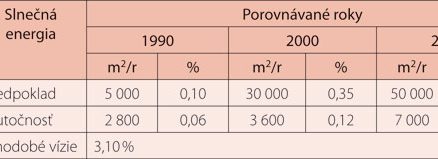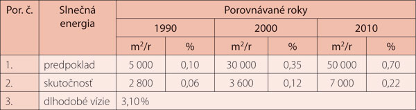 Slnečná energia a slnečné energetické systémy sa využívajú v rodinných domoch, bytových domoch a v individuálnych stavbách počas letného obdobia. V súčasnosti možno konštatovať, že inštalovaná plocha kolektorov predstavuje v posledných rokoch 4 000 až 7 000 m2 ročne (tab. 5) a slúži na prípravu teplej vody a čiastočne na podporu vykurovania. V porovnaní s inými krajinami EÚ je to však zanedbateľný údaj. Pričinil sa o to určite aj fakt, že na Slovensku dosiaľ nebol žiadny stimul na podporu slnečných energetických systémov pre fyzické osoby.