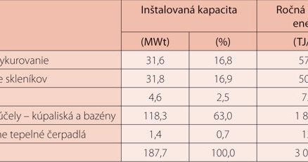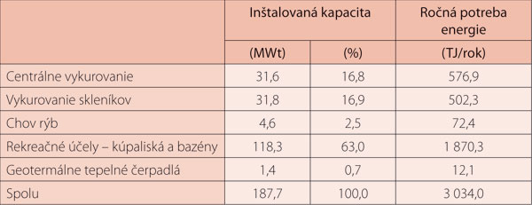 Celkové množstvo geotermálnej energie využívanej v 27 lokalitách predstavuje hodnotu tepelného výkonu 88,52 MWt s výdatnosťou 764 l/s. Overený tepelný výkon v existujúcich projektoch je 314,3 MWt (pričom je predpoklad, že geotermálna voda sa vychladí na referenčnú teplotu θr = +15 °C). Údaje o využívaní zdrojov geotermálnej energie na jednotlivé účely sú uvedené v tab. 6.