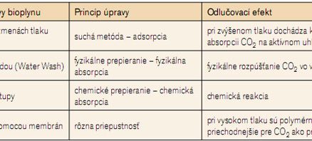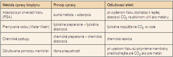 Surový bioplyn možno upravovať prepieraním (fyzikálna a chemická absorpcia), suchou metódou na báze adsorpcie a odlučovaním pomocou membrán. V tabuľke je zobrazený prehľad metód úprav bioplynu, ich princíp a odlučovací efekt.