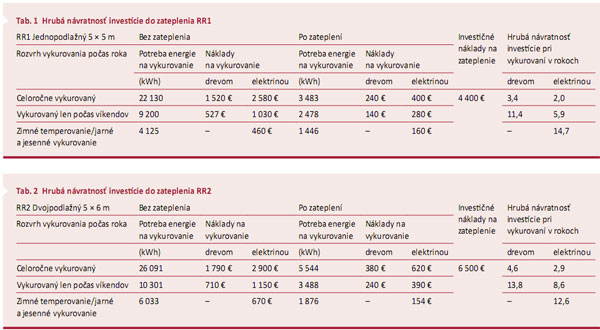 V tab. 1 a 2 je zdokumentovaná hrubá návratnosť investície [2] do zlepšenia tepelnoizolačných vlastností obalového plášťa pre jednotlivé modely obsadenosti. Predpokladané náklady na vykurovanie sú tu vyčíslené pri vykurovaní drevom a elektrickou energiou. Hrubá návratnosť investície do zateplenia významne klesá s častejším využívaním rekreačného domu.