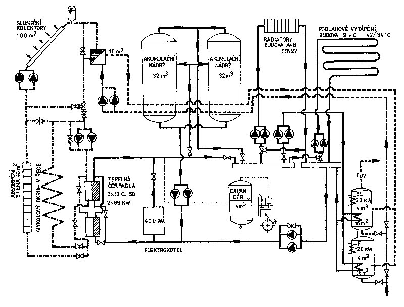 Projekt využitia obnoviteľných zdrojov energie nahrádzal elektroakumulačné teplovodné vykurovanie dvoma tepelnými čerpadlami. V čase realizácie (1982) sa však vo vtedajšej ČSSR tepelné čerpadlá s výkonom 60 kW nevyrábali. V ČKD Choceň sa na účely inštalácie v Herbertove ako tepelné čerpadlá využili dve chladiace zariadenia typu voda – voda (chladiče vody 12 CJ 50 a CJ 70, prestavenie ističov tlaku) s tepelným výkonom 60 kW, s kompresormi BWW 411 s príkonom motora 18,5 kW (obr. 3). Tepelné čerpadlá sa určili na prečerpávanie tepla z rieky cez výmenník s nemrznúcou zmesou (obr. 4) a alternatívne tiež zo sústavy solárnych kolektorov a absorpčnej steny.
