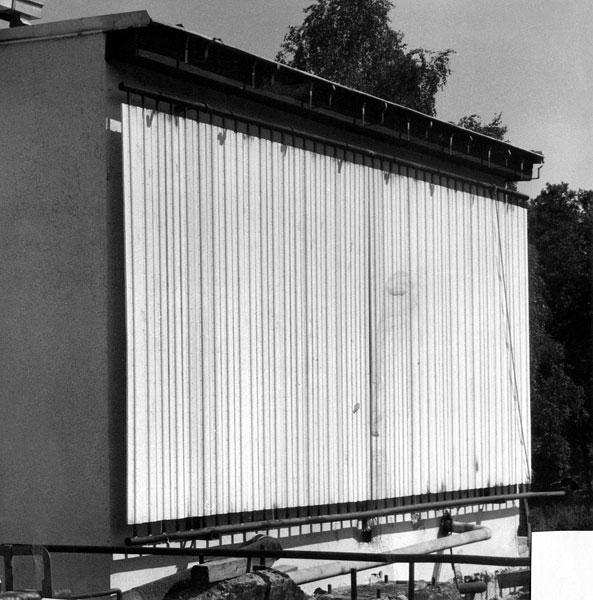Absorpčná stena (obr. 5) s celkovou plochou 40 m2 využívala energiu slnečného žiarenia a tepla okolitého vzduchu ako nízkopotenciálny zdroj energie pre primárny okruh tepelných čerpadiel. Najmä v prechodnom období (jar, jeseň) bolo jej využitie energeticky výhodnejšie ako využitie chladnej vody v náhone. Pri dostavbe turbínovej haly v rámci rekonštrukcie v roku 1994 sa však musela odstrániť (novou prístavbou sa celkom zatienila) a od tých čias v systéme nie je.