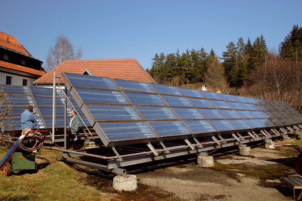 Použité solárne kolektory boli predmetom vývoja doc. Broža na katedre techniky prostredia koncom 70. rokov [1]. Ide o typ mierne koncentrujúceho solárneho kolektora s optimalizovaným Winstonovým zrkadlovým koncentrátorom slnečného žiarenia. Maximálny okamžitý výkon kolektorov je asi 40 kW s ročnou dodávkou tepla 36 až 40 MWh. Kolektory slúžia prednostne na prípravu teplej vody. Pokiaľ je však teplota teplonosnej látky po ochladení vo výmenníku prípravy teplej vody teplejšia ako teplonosná látka z náhonu do tepelných čerpadiel (TČ), možno zmiešavacou armatúrou prepojiť okruh kolektorov a primárny okruh tepelných čerpadiel a zvýšiť tak teplotu na vstupe do TČ. Tým možno zvýšiť vykurovací faktor tepelných čerpadiel a zlepšiť energetickú bilanciu zdroja.