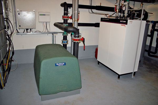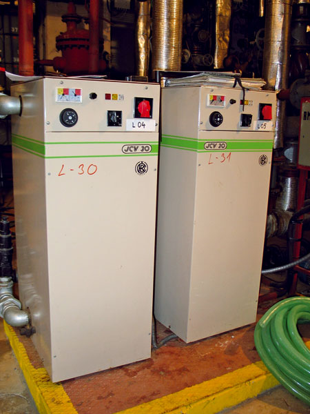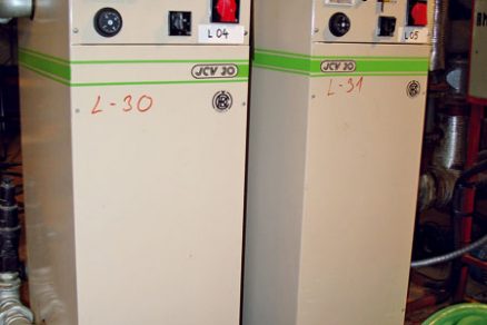 Nainštalovali sa dva náhradné elektrokotly, každý s výkonom 25 kW (obr. 9). Tým zanikol dôvod na udržiavanie akumulátorov s celkovým objemom 64 m3, pretože na solárne kolektory postačuje akumulácia 8 m3 vo dvoch stojatých ohrievačoch TV. Veľké akumulátory sa demontovali a v ich priestore sa teraz nachádza garáž. Na prípravu teplej vody slúžili ohrievače vybavené dvoma súpravami elektrických odporových telies 3 × 3 kW.