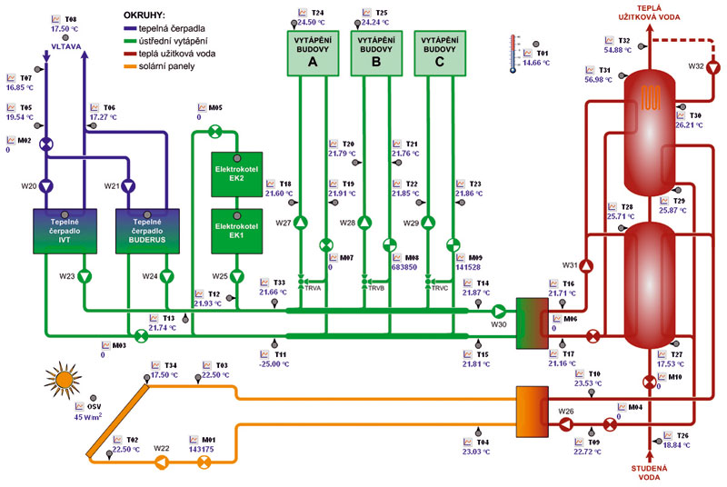 Monitorovací systém každé dve minúty archivuje 96 výstupov (teploty, prietoky, logické stavy zariadenia a pod.) z ktorých možno energetickú bilanciu sledovaných systémov vyhodnotiť nasledovne: