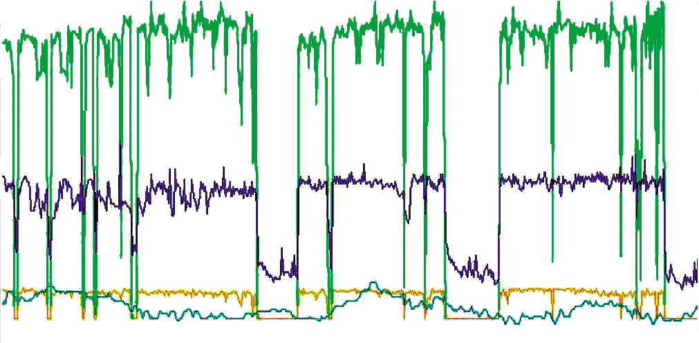Ako príklad uvádzame prevádzku jednotky Sunmachine inštalovanej v rodinnom dome v Nemecku. Samotné zariadenie má osadených vyše 28 snímačov rôznych veličín, ktoré sa zaznamenávajú a vyhodnocujú v riadiacej jednotke. Na základe týchto údajov sa riadi nielen zdroj energie, ale aj celý systém vykurovania a prípravy teplej vody v dome. Jednotka je zapojená do vykurovacieho systému podľa odporúčaní výrobcu cez akumulačný zásobník s osadenou elektrickou výhrevnou vložkou. Zapojenie aj s meranými teplotami je na obr. 4. Riadenie výkonu kogeneračnej jednotky závisí v tomto prípade od teploty vykurovacej vody v strede akumulačného zásobníka. Akumulačný zásobník sa vyhrieva primárne elektrickou ohrevnou vložkou, následne, ak sa týmto spôsobom ohrevu nedosiahne nastavená hodnota na úrovni približne +43 °C, spustí sa kogeneračná jednotka a vypne sa ohrevná elektrická vložka. Výkon jednotky po štarte nabieha na približne 90 % skutočného nominálneho výkonu v priebehu 45 minút. Ďalej jednotka riadi proces spaľovania v rozsahu 70 až 100 % skutočného nominálneho tepelného výkonu, kým teplota v strede zásobníka nedosiahne hodnotu približne 67 °C, potom sa zastaví prívod paliva (drevných peliet) a spaľovacieho vzduchu. Na obr. 5 je znázornený graf priebehu teplôt a výkonov počas dvoch mesiacov prevádzky vo vykurovacom období. Bledomodrá krivka na grafe znázorňuje priebeh vonkajšej teploty vzduchu. Výrez grafu zo 4. a 5. januára je znázornený na obr. 6. Na oboch grafoch možno podľa zelenej krivky vidieť, že reálny nominálny tepelný výkon je približne o 3 kW vyšší, ako ho uvádza výrobca. Výkon dosiahnutý na strane výroby elektrickej energie je maximálne 1,3 kW, čo nie je ani polovica hodnoty elektrického výkonu jednotky udávaného výrobcom. Na grafoch ďalej vidieť tmavomodrú krivku, ktorá znázorňuje priebeh teplôt na vratnom potrubí smerujúcom do jednotky. Teplota sa v čase prevádzky kogeneračnej jednotky pohybuje od 40 do 75 °C. Mechanický výkon osadeného Stirlingovho motora závisí od rozdielu teploty na ohrievanej strane (červená krivka na obr. 6), ktorá dosahuje teplotu do 70 °C, a teploty vratnej vody. Rozdiel týchto teplôt je teda v rozpätí 60 – 70 K, takže pokles alebo nárast teploty vratnej vody v rozsahu 35 °C sa na mechanickom výkone motora výrazne nepodieľa. Ohrievaná časť motora má aj určitú tepelnú zotrvačnosť, výkon motora je teda relatívne stabilný, pohybuje sa na úrovni reálneho nominálneho výkonu. Výrazný pokles až zastavenie motora však nastáva už pri znížení teploty na ohrevnej strane pod 65 °C.