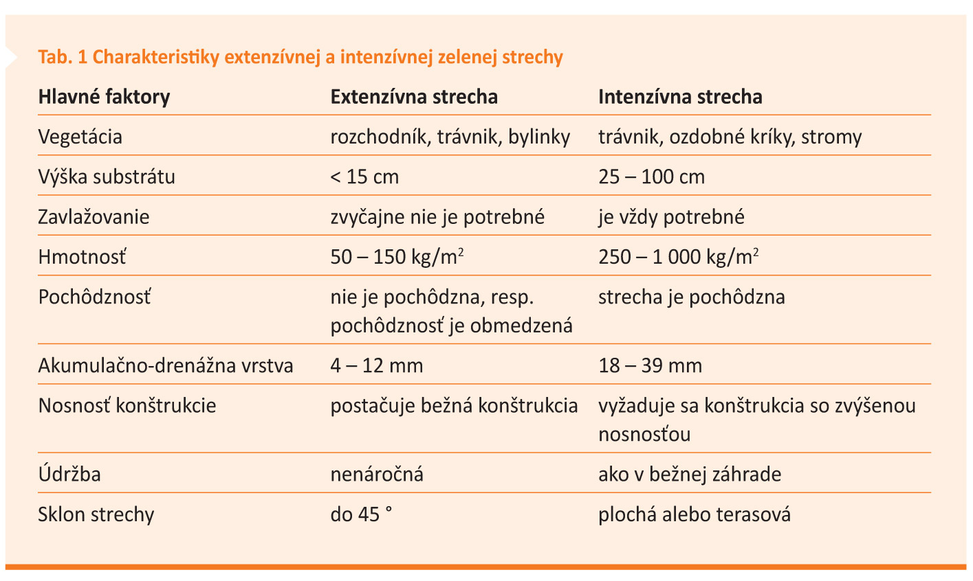 Často citovanou odpoveďou na adaptáciu budov sú okrem iného zelené strechy. Podľa typu vegetácie sa zelené strechy delia na extenzívne a intenzívne (tab. 1; obr. 1). S tým súvisia aj rozdielne možnosti funkčného využitia strechy, potrebná hrúbka substrátu, potreba umelého zavlažovania a ďalšie parametre.