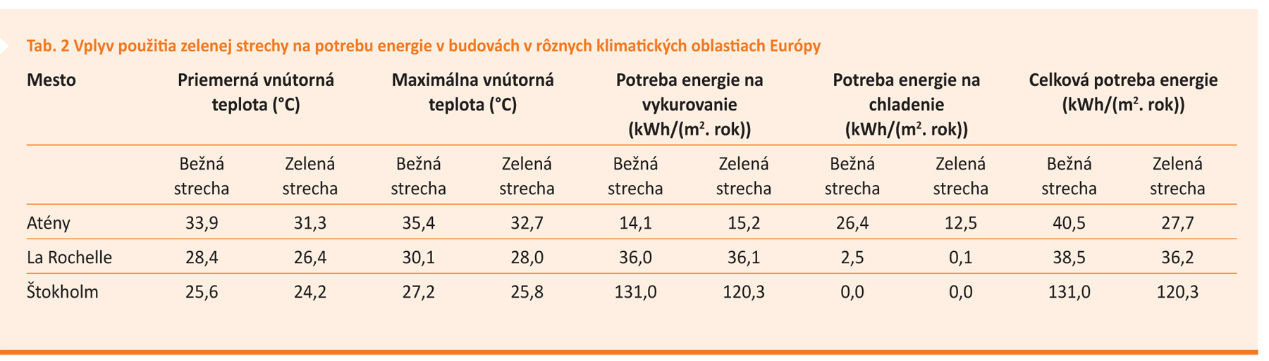 Napokon spomeňme štúdiu [6], ktorá počíta potrebu energie na vykurovanie a chladenie pri použití zelenej strechy na budovách v rôznych klimatických oblastiach Európy (tab. 2). Na budove – rodinnom dome – v La Rochelle na francúzskom pobreží Atlantického oceánu sa vďaka zelenej streche znižuje prehrievanie interiéru a potreba energie o 6 %.