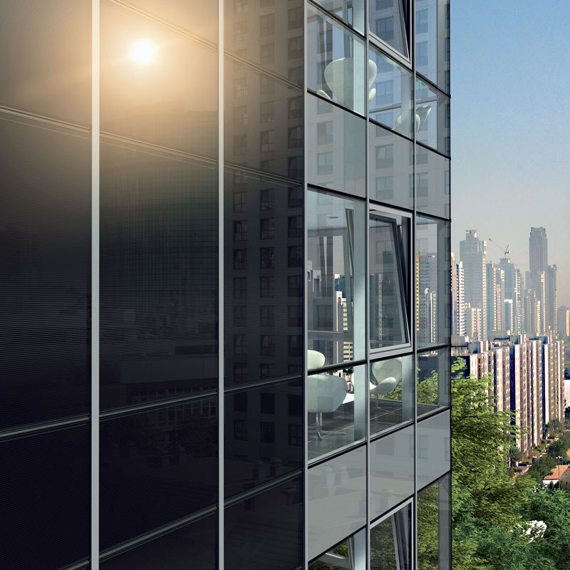 | Jeden príklad za všetky Na trhu je dostupná novinka modulu so špeciálnou viacvrstvovou konštrukciou tvorenou vrstvami skla, kremíka a krycej laminátovej fólie s minimálnou hrúbkou – len 8 mm. Čelné sklo, vybavené transparentnou vrstvou (TCO – Transparent Conductive Oxide), ktorá spoločne s kontaktnou vrstvou elektricky prepojuje vrstvy kremíka produkujúce elektrický prúd, má hrúbku 3,2 mm. Hrúbka zadnej sklenenej vrstvy sa odlišuje podľa konkrétnych statických parametrov. Kombinácia povrchovej úpravy vrchného skla s vrstvami amorfného a mikromorfného kremíka vedie k efektívnej výrobe elektrickej energie. Prúd vzniká transformáciou slnečného žiarenia v oboch kremičitých vrstvách, v jednej z amorfného (a-Si:H) a v druhej z mikrokryštalického kremíka (μc-Si:H). Obe vrstvy spolu využívajú výrazne širšie svetelné spektrum a vytvárajú charakteristický tmavý vzhľad. Zadné sklo, čelné sklo a elektricky účinné tenké vrstvy tvoria spolu so špeciálnou krycou laminátovou fóliou (PVB) pevný homogénny celok. Z hľadiska rozmerov možno jednotlivo inštalovať moduly s rozmermi od 200 × 300 mm (š × v) do 2 200 × 2 600 mm. Pri stavebnicovom riešení možno objednať aj maxi rozmer 2 000 × 4 000 mm (š × v). Semitransparentný modul s voliteľným stupňom priehľadnosti 0 – 50 % dosahuje výkon až 80 Wp/m². |