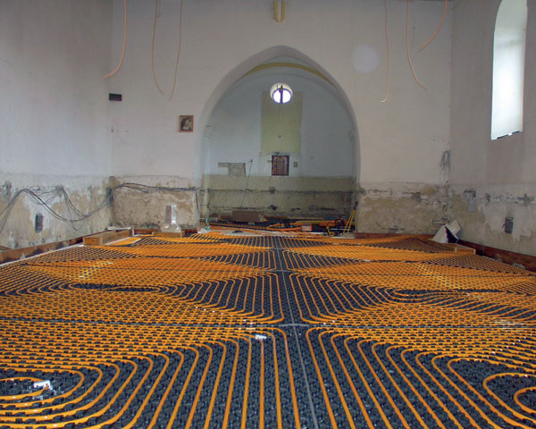 V roku 2005 sme rekonštruovali kostol a prišla na rad aj otázka jeho vykurovania. Rozhodli sme sa pre tepelné čerpadlo zem – voda a podlahové vykurovanie. „Predtým tu boli elektrické pece a v kostole bývala taká zima, že mi v sakristii zamrzla voda. Keď som rozprával, išla mi para od úst,“ spomína si pán farár. „Ľudia museli chodiť naobliekaní, ale aj tak tu mrzli… Odkedy je naplno v prevádzke tepelné čerpadlo, platíme síce rovnako, rozdiel je však v tom, že už tu nie je zima. V kostole je po celý rok stabilná teplota 15 °C, čo vyhovuje ľuďom aj stavbe.“ Tepelné čerpadlo nepotrebuje žiadnu údržbu ani palivo: „Žije si svojím životom, má svoj program a ja sa doňho veľmi nestarám,“ pochvaľuje si. „Bolo by schopné vykúriť to tu aj na vyššiu teplotu, ale snažím sa udržať tu 15 °C, pretože je to starý kamenný objekt. Bojím sa napríklad zrážania vody v stropoch, kde sú drevené trámy. Zatiaľ sa to ukazuje ako optimálna teplota – aj ľudia sa cítia príjemne, aj objekt sa správa tak, že táto teplota mu neškodí. Asi treba dlhší čas na to, aby som mohol robiť presné závery, ale už teraz viem, že to bola dobrá investícia, pretože tu máme konečne, na rozdiel od minulosti, teplo.“