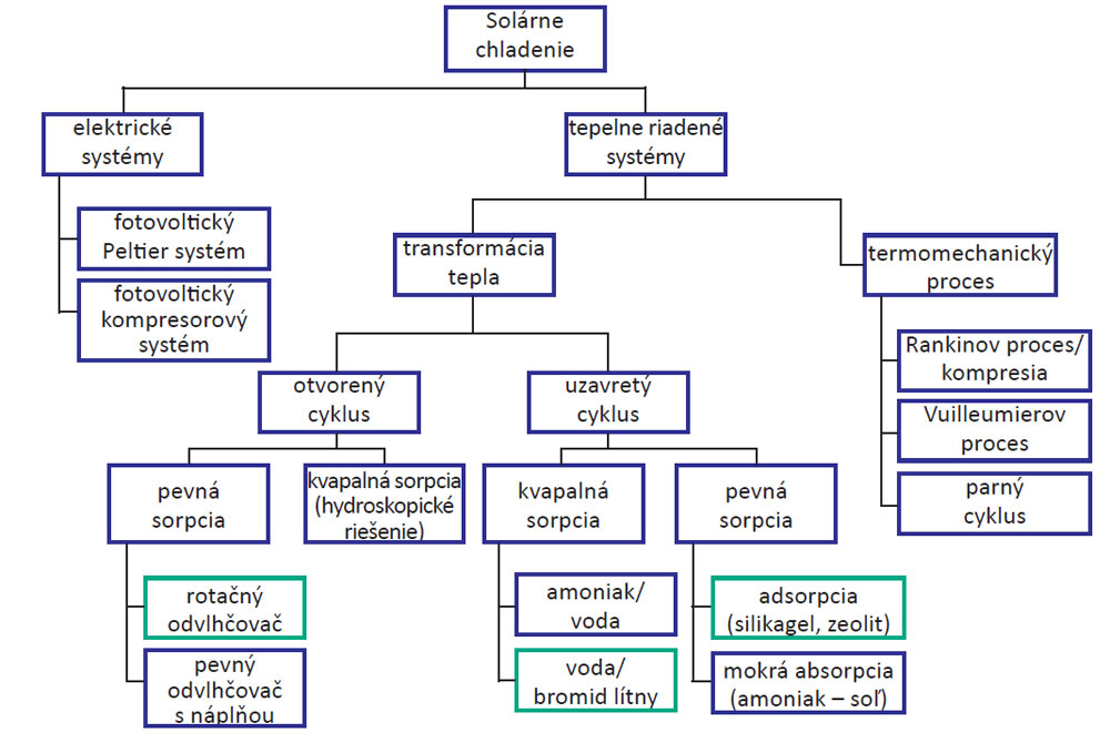 Prehľad systémov solárneho chladenia ukazuje na obr. 2. Systémy, ktoré sú označené modrou farbou, sú vo výskumnej a skúšobnej fáze. Systémy označené zelenou farbou sa bežne používajú. Ďalej sa budem zaoberať konkrétne dvomi typmi solárnych chladiacich systémov  – absorpčným a adsorpčným chladením.