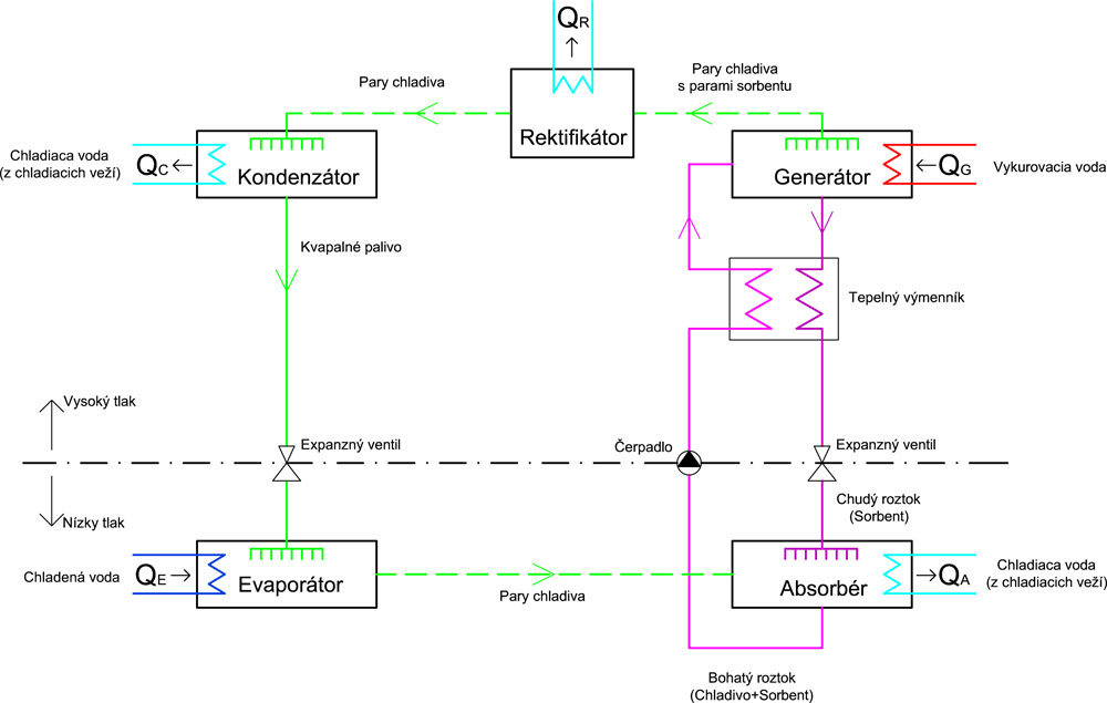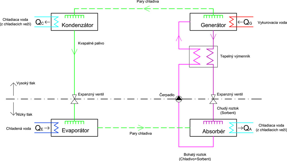 Obr. 3 Základná schéma absorpčného chladiaceho systému (LiBr)