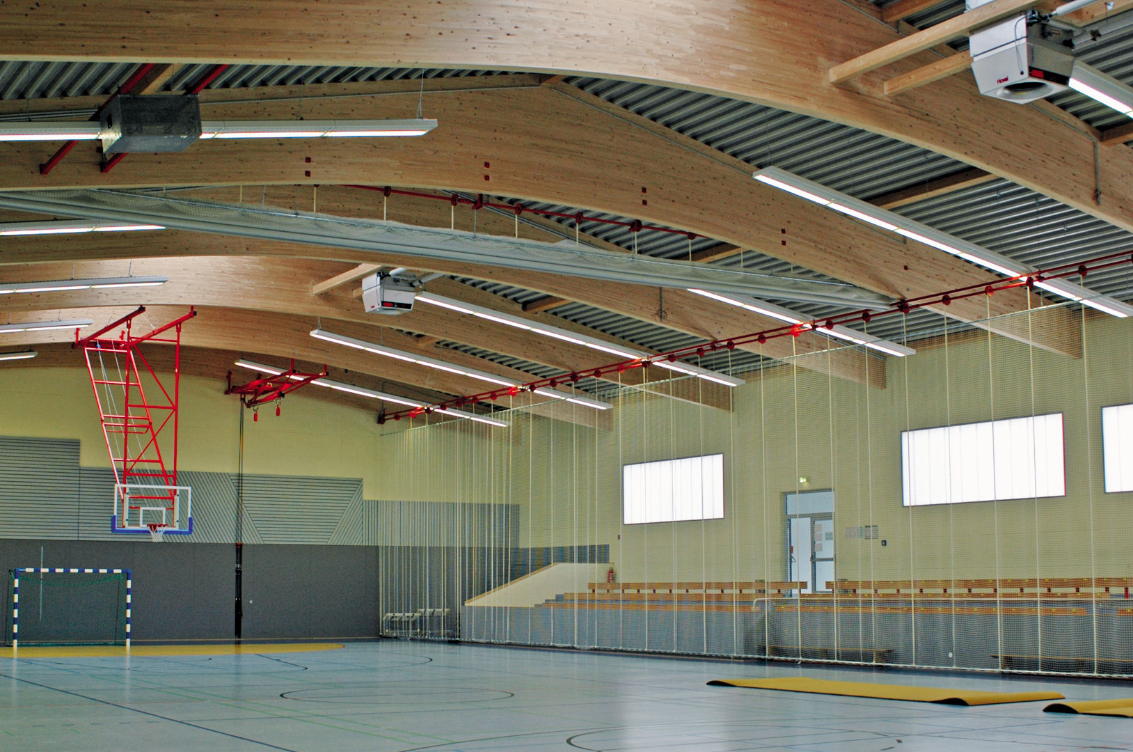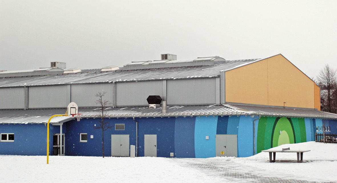 Športová hala na ilustračných obrázkoch (Goldbach, Thüringen) je typická dvojúčelová hala s úzkym priestorom tribúny (obrázok 1, 2, 3). Nosná konštrukcia je v tomto prípade tvorená drevenými väzníkmi, ktoré znemožňuje inštaláciu vedenia vzduchového potrubia. Pre vetranie priestorov športovej haly bol z tohoto dôvodu zvolený decentrálny systém, pričom každé herné pole je ošetrené jednotkou so spätným získavaním tepla a prietokom vzduchu 5500 m3/h. O vykurovanie haly sa starajú tieto jednotky, vybavené automaticky prestaviteľnou vírivou výustkou Air-Injector. Výustka intenzívne a bez prievanu dodáva čerstvý vzduch do jednotlivých častí haly a zabezpečuje požadovanú teplotu. Podľa meraní teplotnej stratifikácie, ktorá činí 0,2 K/m prispievajú decentrálne vzduchotechnické jednotky na základe zníženého teplotního rozdielu medzi podlahou a stropom k očakávaným úsporám energie.