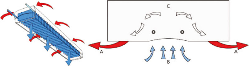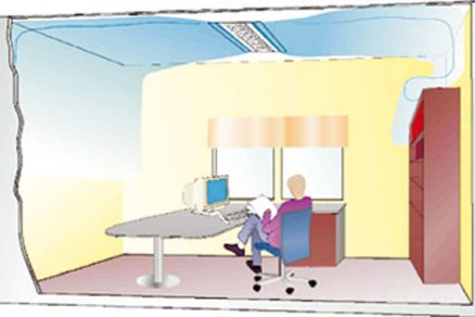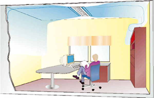 V prípade štandardných modulových kancelárií je dôležité, aby chladený primárny vzduch distribuovaný z trámu prechádzal dlhou zmiešavacou zónou pred dosiahnutím pobytovej zóny. Po výstupe vzduchu z trámu môže vzduch priľnúť k stropu, stene alebo časti podlahy a zatiaľ čo prúdi pozdĺž týchto povrchov, mieša sa so vzduchom miestnosti a teplota cirkulujúceho vzduchu sa zvyšuje. Takto sa dosiahne komfortná vnútorná klíma bez rizika prievanu a chladiaca kapacita sa môže odovzdať bez akýchkoľvek problémov. V priestoroch s veľkými plochami, ako sú obchody a veľkoplošné kancelárie, je situácia týkajúca sa chladiacich trámov odlišná od bežných kancelárií. Obvykle tu nie sú blízke steny, pozdĺž ktorých by primárny vzduch mohol prúdiť, a tak najčastejším spôsobom inštalácie je umiestnenie dlhých paralelne inštalovaných chladiacich trámov kolmo na fasádu.