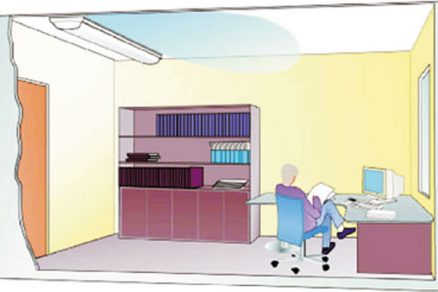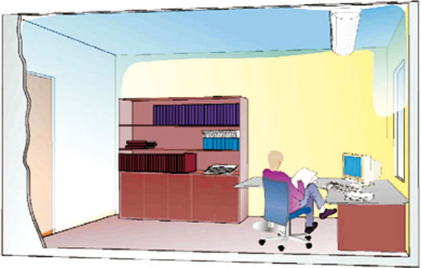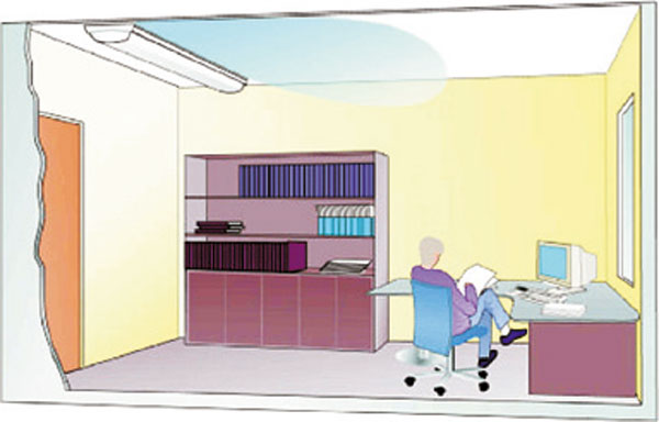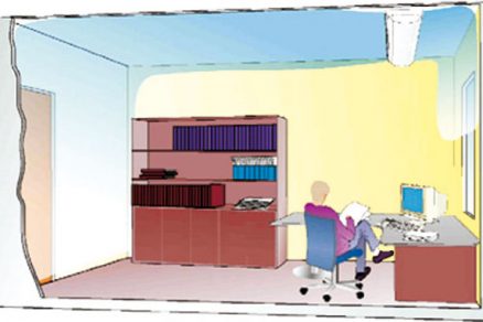 Umiestnenie chladiacich trámov rovnobežne so zadnou stenou (ktorá susedí s chodbou) je vhodné do štandardných modulových kancelárií, veľkoplošných kancelárií a pod. (obr. 4). Distribúcia vzduchu je buď symetrická alebo asymetrická.