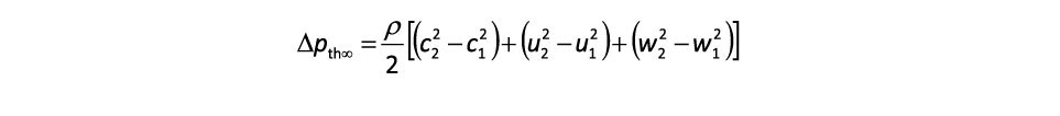 Práve vďaka tejto úprave možno určiť podiel statického a dynamického tlaku z celkového tlaku. Dynamický tlak je daný rozdielom štvorcov absolútnych rýchlostí c. Rozdiel relatívnych rýchlostí (w) a obvodových rýchlostí (u) hovorí o veľkosti statickej zložky tlaku (predstavuje všetok dispozičný tlak potrebný na prekonanie hydraulických odporov a samotnej potrubnej siete). V prípade axiálnych ventilátorov sa obvodová rýchlosť u1 (na malom obežnom kolese) rovná obvodovej rýchlosti u2 a vzduch prúdi celým obežným kolesom, takže vzťah (3) sa potom mení na vzťah (5), pričom platí že u = u1 = u2