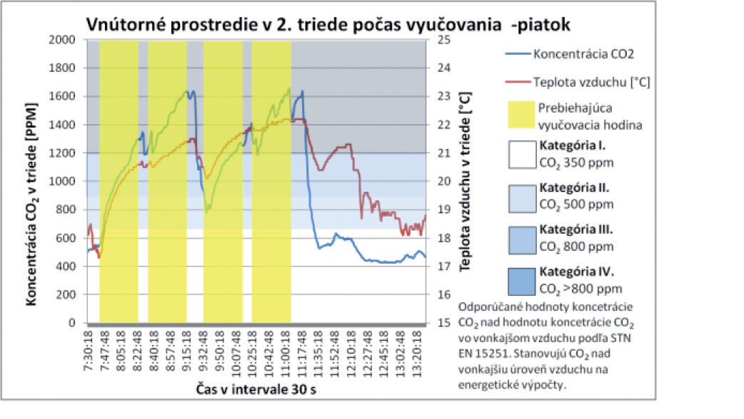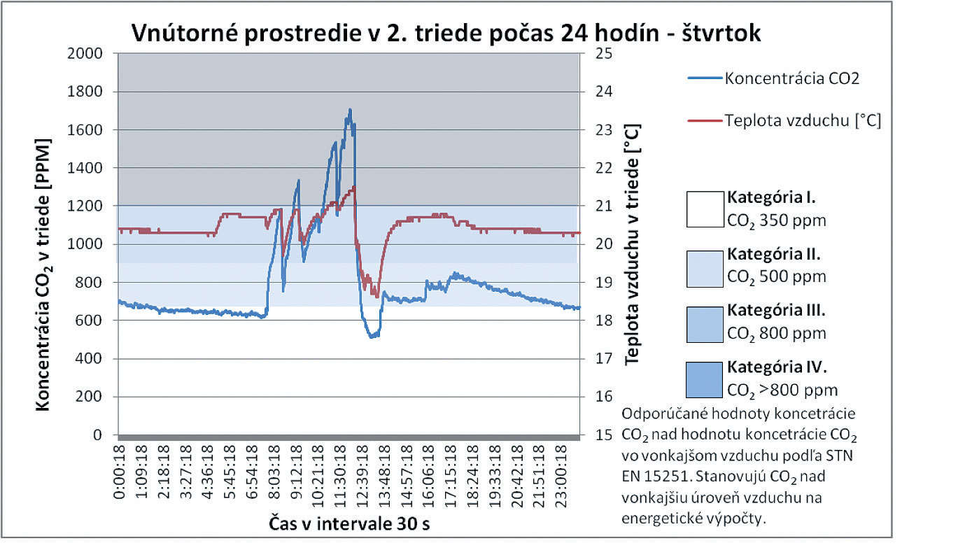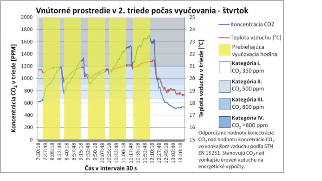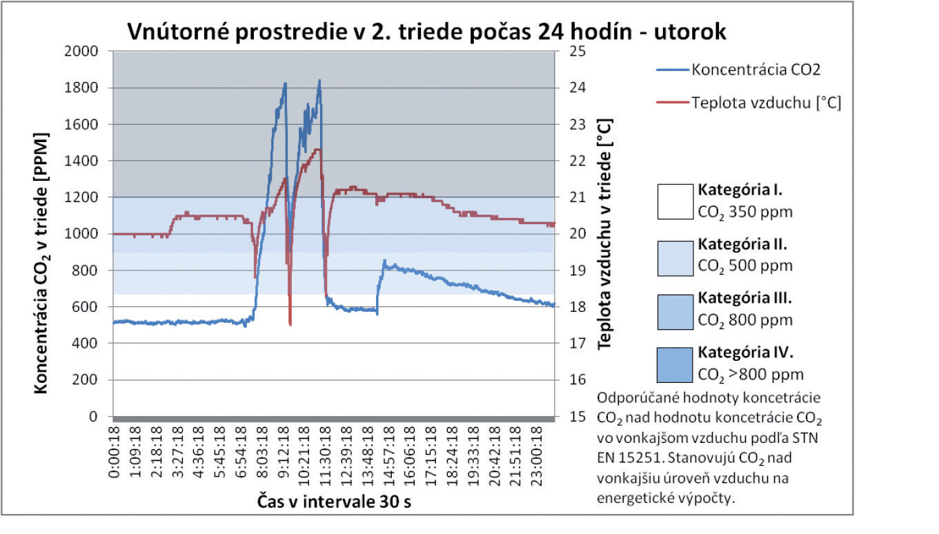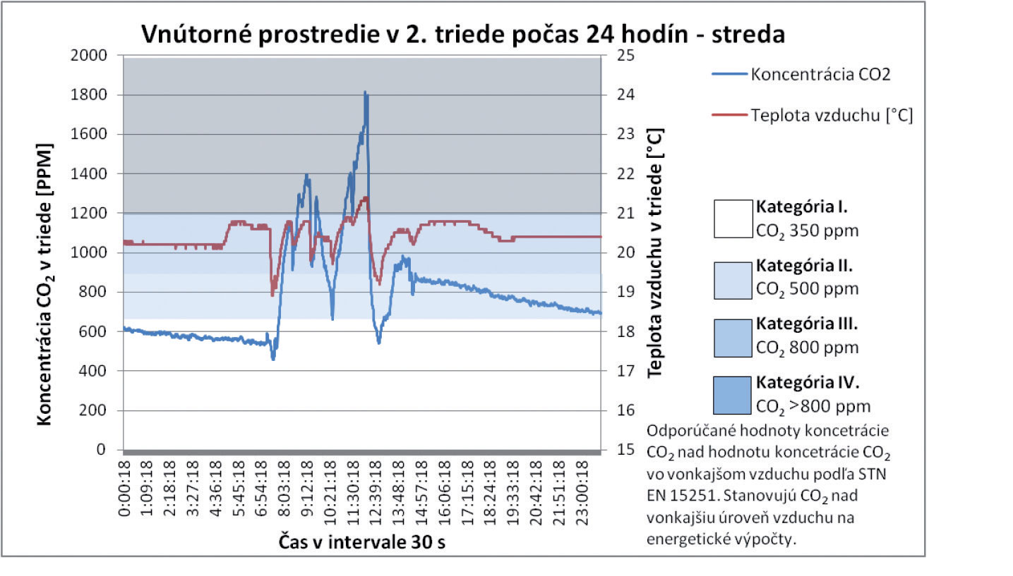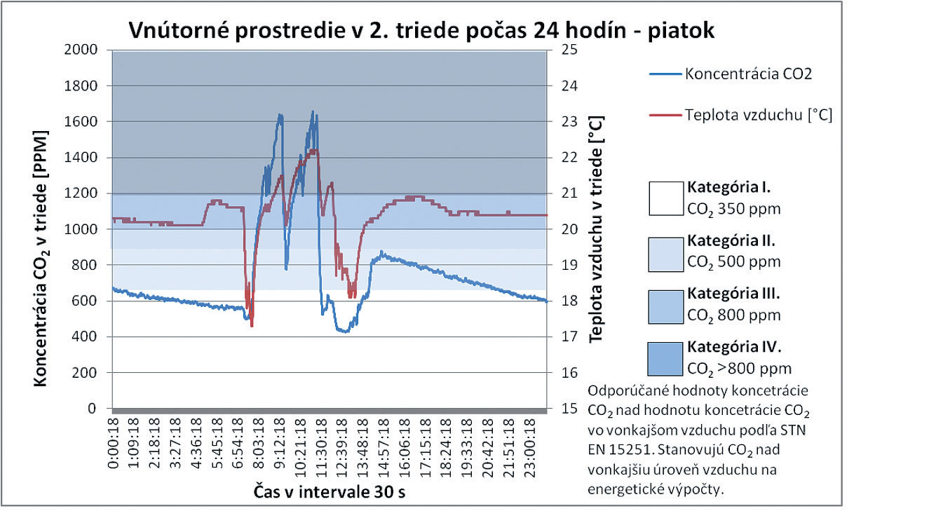 Z celkových priebehov teploty vzduchu, ako aj koncentrácie CO2 v triede, nie je možné jednoznačne stanoviť závislosť. Vo vybraných analyzovaných úsekoch však možno pozorovať vzájomný pokles oboch parametrov. Tento jav nastáva v čase vybraných prestávok počas vyučovania, keď sú triedy prázdne a výmena vzduchu v triede postačuje nato, aby bol pokles koncentrácie výrazne vyšší. V čase, keď sú triedy prázdne, sa dá pozorovať postupný pokles koncentrácie CO2 zapríčinený infiltráciou a exfiltráciou vzduchu. Priemerná koncentrácia CO2 pri príchode prvých žiakov 2. ročníka je 525 ppm. Táto priemerná hodnota je o 145 ppm vyššia, ako je priemerná koncentrácia CO2 vo vonkajšom ovzduší počas celého merania. Z týchto poznatkov sa dá poukázať aj na skutočnosť, že samotnou infiltráciou vzduchu nie je možné zabezpečiť vetranie tried na úroveň koncentrácie CO2 v exteriéri. Tento poznatok preukazujú aj výsledky meraní realizovaných počas celého týždňa, pričom vidieť jasnú tendenciu nárastu počas každého nasledujúceho dňa v priebehu celého týždňa.