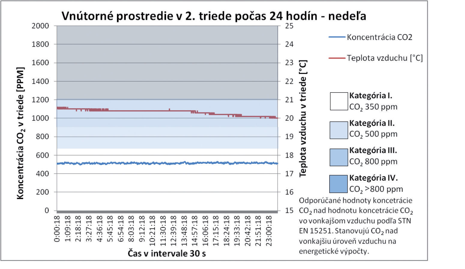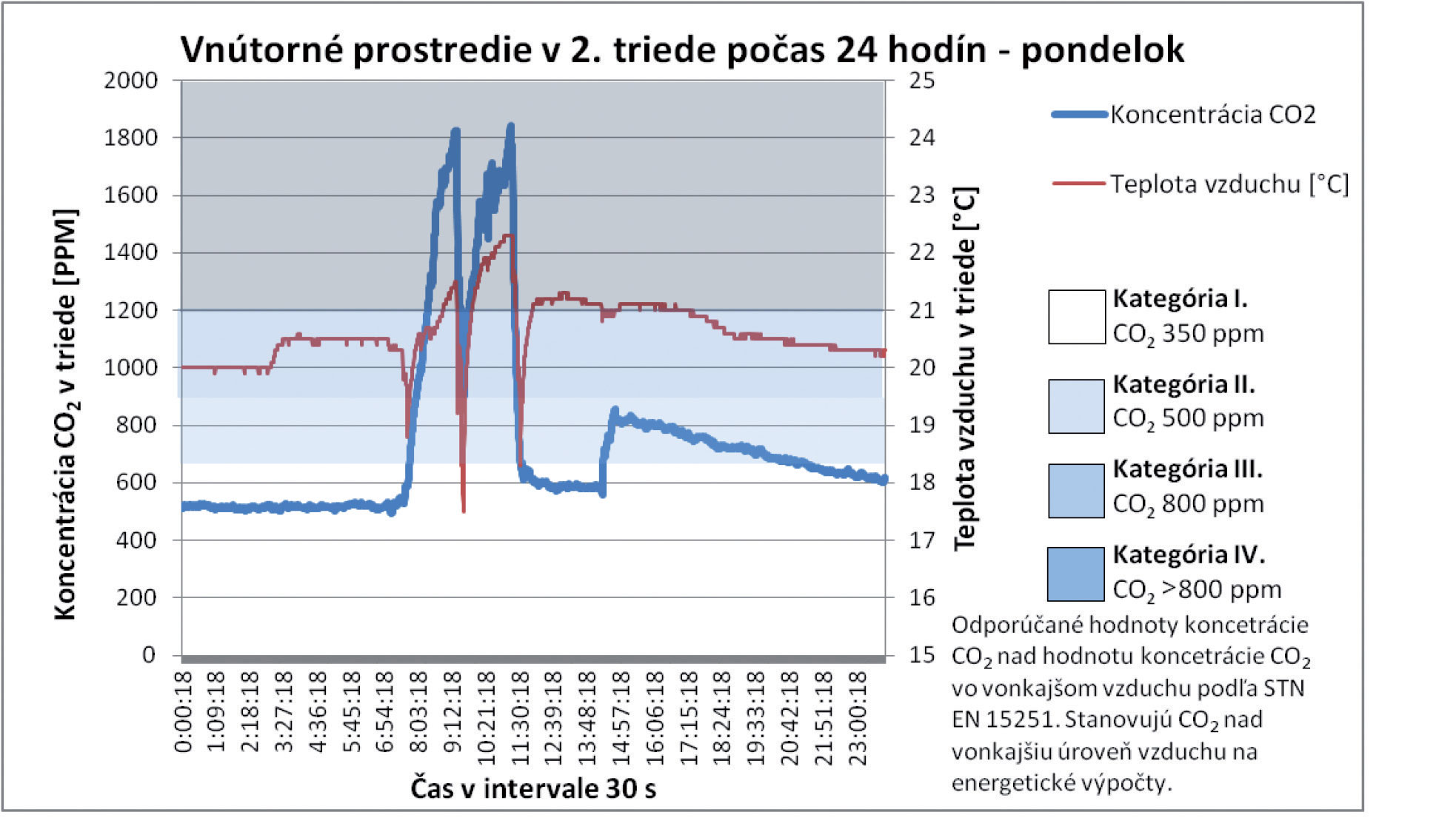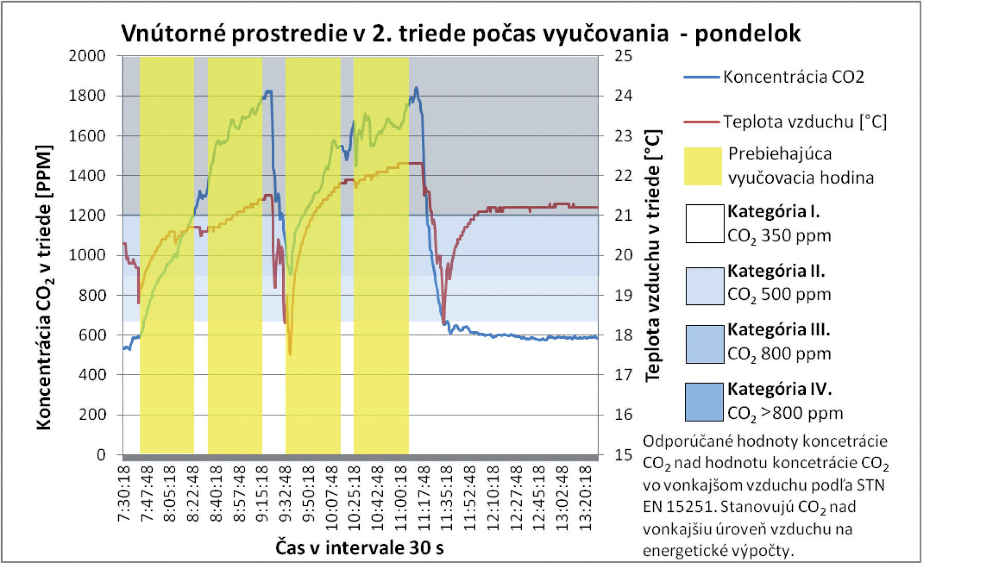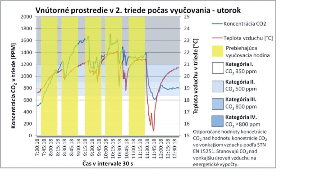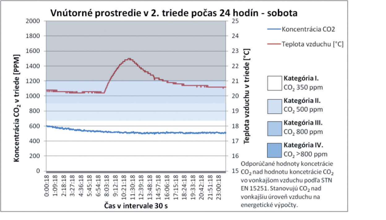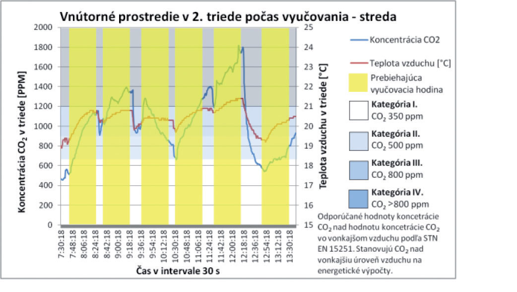 Z celkových priebehov teploty vzduchu, ako aj koncentrácie CO2 v triede, nie je možné jednoznačne stanoviť závislosť. Vo vybraných analyzovaných úsekoch však možno pozorovať vzájomný pokles oboch parametrov. Tento jav nastáva v čase vybraných prestávok počas vyučovania, keď sú triedy prázdne a výmena vzduchu v triede postačuje nato, aby bol pokles koncentrácie výrazne vyšší. V čase, keď sú triedy prázdne, sa dá pozorovať postupný pokles koncentrácie CO2 zapríčinený infiltráciou a exfiltráciou vzduchu. Priemerná koncentrácia CO2 pri príchode prvých žiakov 2. ročníka je 525 ppm. Táto priemerná hodnota je o 145 ppm vyššia, ako je priemerná koncentrácia CO2 vo vonkajšom ovzduší počas celého merania. Z týchto poznatkov sa dá poukázať aj na skutočnosť, že samotnou infiltráciou vzduchu nie je možné zabezpečiť vetranie tried na úroveň koncentrácie CO2 v exteriéri. Tento poznatok preukazujú aj výsledky meraní realizovaných počas celého týždňa, pričom vidieť jasnú tendenciu nárastu počas každého nasledujúceho dňa v priebehu celého týždňa.