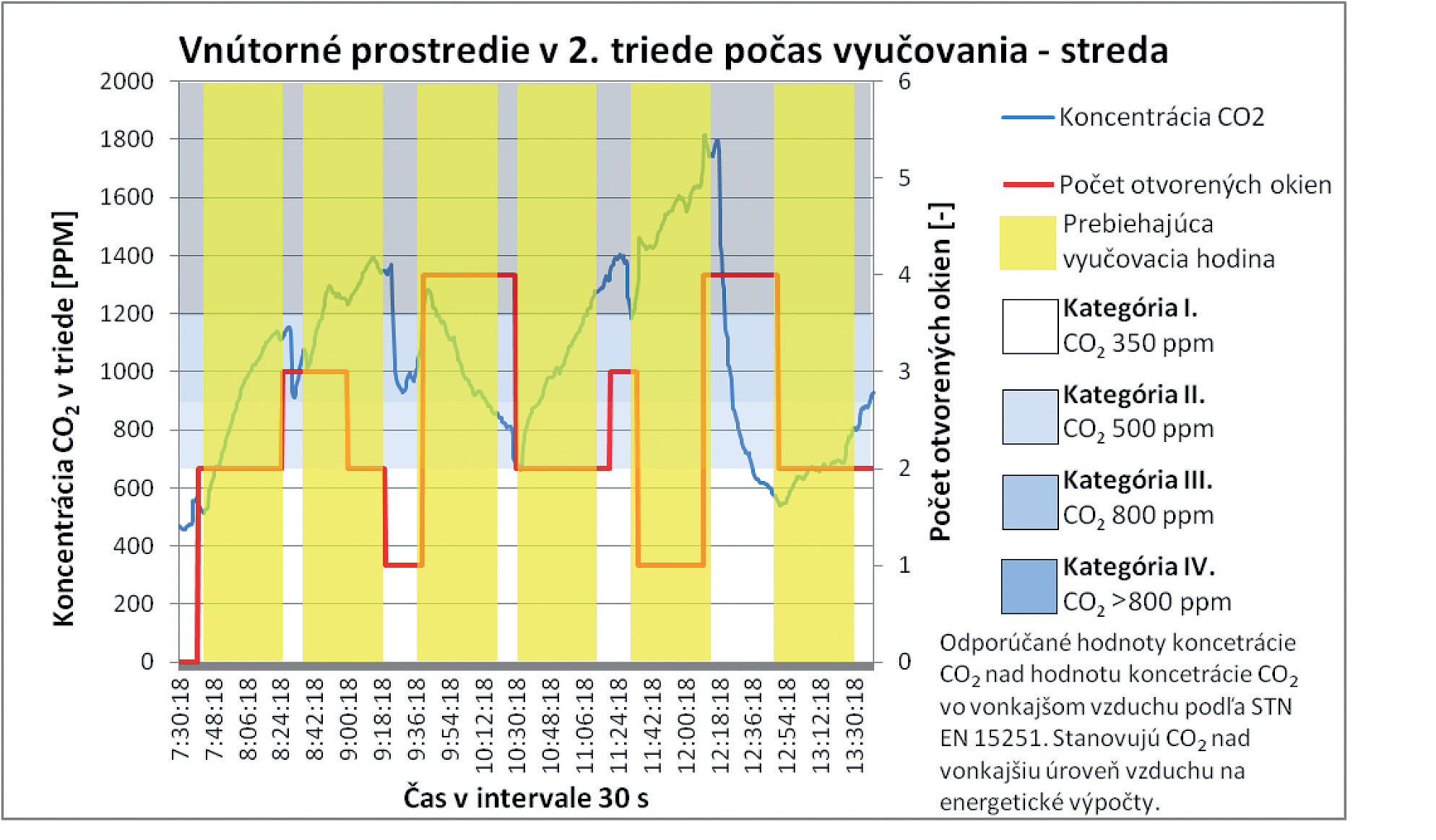 Obr. 4 Koncentrácia CO2, počet a dĺžka otvorenia okien počas vyučovania v triede 2. ročníka [10]