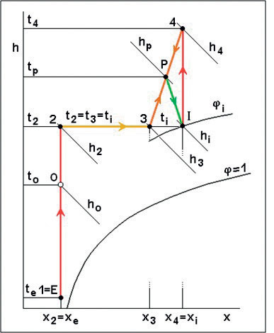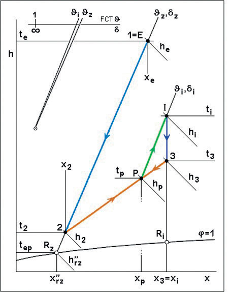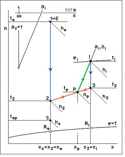 Ventilátorová jednotka nasáva vzduch z miestnosti so stavom I, ktorý sa upravuje v ohrievači na stav 4, v ktorom sa následne vyfukuje späť do miestnosti. V nej sa zmieša prúd vzduchu dopravovaný z ÚKJ v stave 3 s prúdom vzduchu vystupujúceho z ventilátorovej jednotky v stave 4, a to na stav P. Vplyvom vlhkostnej záťaže a tepelných strát miestnosti sa stav vzduchu v nej mení zo stavu P na stav I.