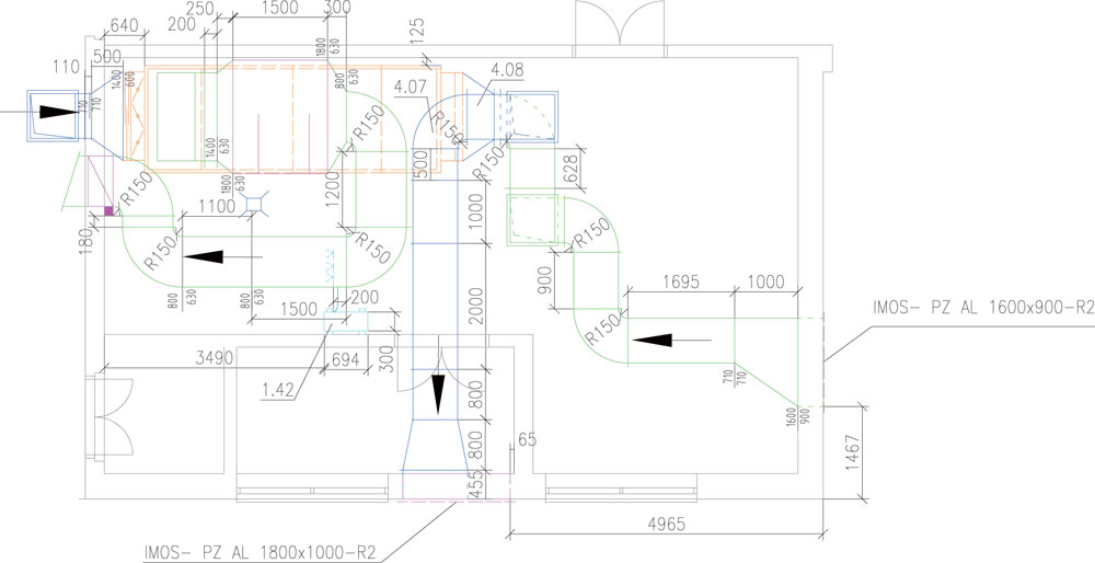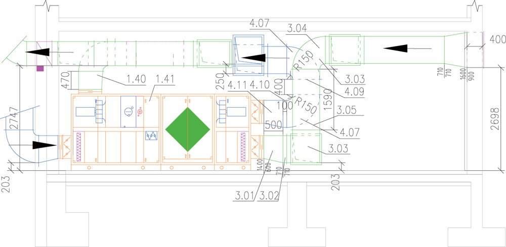 V strojovni vzduchotechniky sú navrhnuté dve ÚKJ vybavené panelovým rekuperačným výmenníkom na dosiahnutie energetickej úspory. Za týmto výmenníkom sa nachádzajú ohrievač a chladič na následnú úpravu vzduchu. Úspora sa dosahuje aj umiestnením cirkulačnej klapky za rekuperačný výmenník. Klapka v prípade potreby (v čase, keď sa v miestnosti nenachádzajú ľudia) uzavrie prívod vonkajšieho čerstvého vzduchu a odvod odpadového vzduchu a vracia späť do miestnosti odpadový vzduch.