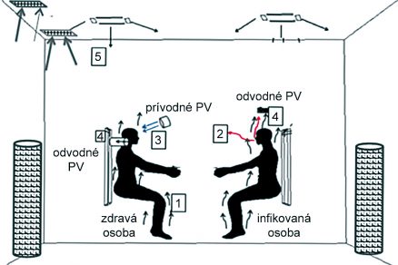 1 – voľný konvekčný tok, 2 – vzduch vydychovaný infikovanou osobou, 3 – personalizovaný prívod vzduchu, 4 – personalizovaný odvod vzduchu, 5 – klasický zmiešavací vetrací systém