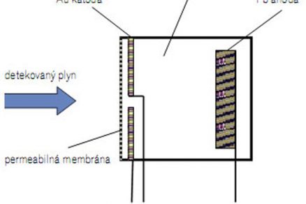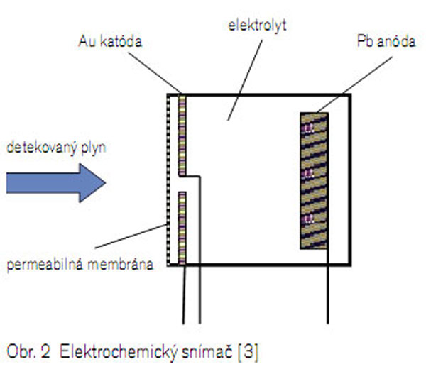 Elektrochemická metóda merania je založená na vzájomnom pôsobení detegovaného plynu a povrchu snímača sprevádzanom chemickou reakciou, pri ktorej sa mení určitá fyzikálna veličina. Základom snímača je elektrochemický článok a elektrolyt s rôznym zložením. Jeden princíp merania spočíva v tom, že kyslík sa na rozhraní vrstvy katóda/elektrolyt premieňa elektrochemickou cestou na elektrický prúd, ktorého veľkosť je úmerná koncentrácii kyslíka v meranej zmesi plynov. Meracia komora obsahuje olovenú anódu a zlatú katódu, ktoré sú ponorené do elektrolytu na báze kyseliny octovej (obr. 2). Tento spôsob možno použiť na detekciu plynov, ktoré oxidujú na kovovom katalyzátore, ako sú platina alebo zlato. Plyny, ktoré sa dajú týmto spôsobom merať, sú oxidy – oxidy dusíka, oxid uhoľnatý alebo oxid uhličitý. Prednosťou týchto snímačov je vysoká citlivosť, na druhej strane však aj kratšia životnosť.