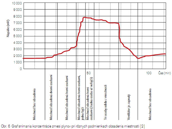 V súčasnosti sa vyrábajú snímače určené na meranie jednej fyzikálnej veličiny alebo kombinované snímače, ktoré monitorujú zároveň teplotu, relatívnu vlhkosť a koncentráciu CO2, resp. zmesi plynov. V rámci jedného priestoru možno použiť snímač CO2 a snímač zmesi plynov, ktoré navzájom pôsobia doplnkovo. Napríklad v prednáškových sálach, kde je cez deň veľká a časovo premenlivá obsadenosť, pôsobí v tomto čase snímač CO2 a po ukončení prevádzky, keď prebiehajú čistiace práce, reaguje snímač zmesi plynov. Na obr. 6 je príklad snímania koncentrácie zmesi plynov pri rôznych podmienkach obsadenia miestnosti.