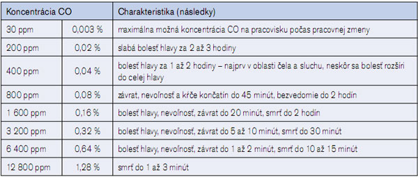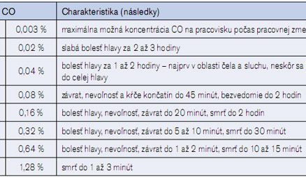 Tab. 2 Zdravotné problémy pri rôznych koncentráciách CO v ovzduší